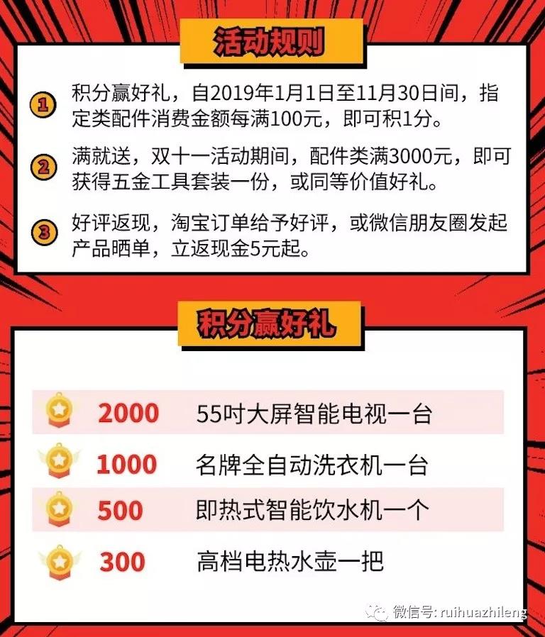2. 满就送,双十一活动期间,配件类满3000元,即可获得五金工具套装一份,或同等价值好礼。