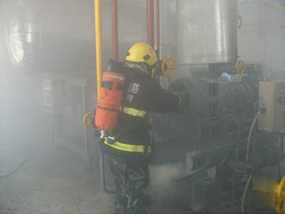 当氨制冷系统发生漏氨事故时,相关人员切不可慌不择路的选择自我逃生。当班操作人员要沉着镇静,以免乱开或错开机器设备上的阀门,导致事故进一步扩大。迅速报警,撤离疏散污染区人员至上风处,并立即隔离150M,严格限制闲杂人员出入。必须正确判断情况,组织有经验的技工进入现场抢救。处理人员必须佩戴正压式呼吸器,穿防毒服。戴好防护人员进入现场,在水压防护下处理泄漏点。关闭阀门或加密封等。在整个氨制冷系统中及时发现漏氨部位,做到早发现,早处理。如是高压管道泄漏,应立即停止压缩机运行,切断漏氨部位与系统连通的管道。若管道不长,可采用放空的办法,待管内余氨放完,并置换后进行补焊。如低压管道(如冷库内冷却设备)漏氨,应迅速查明漏点,关闭其供液阀。由于库房氨汽甚浓,可开风机排除,并用酸酸溶液喷雾中和。若条件允许,可启动压缩机将该冷却设备内氨液抽回。操作人员可根据制冷系统不同特点和具体情况,采取灵活、安全、有效的处理方法。