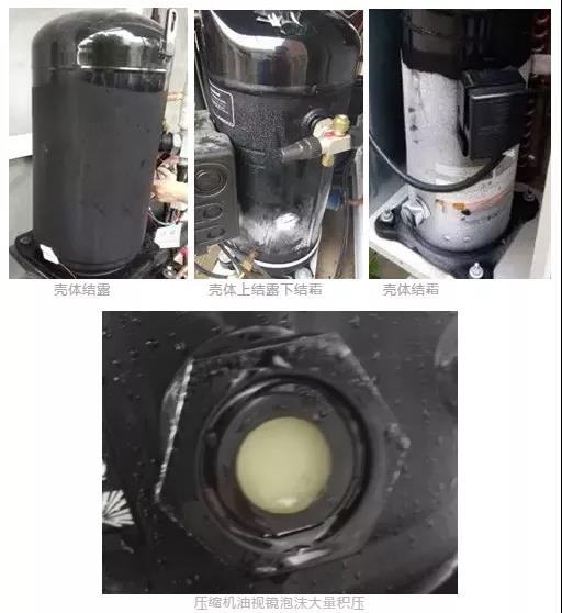 判断压缩机是否患上了持续回液病症,要先从外部观察压缩机是否出现了压缩机壳体大面积凝露甚至结霜,或者压缩机油视镜泡沫大量积压的情况。如果出现这两种症状,压缩机则可能患上了持续回液,需进行进一步检查。