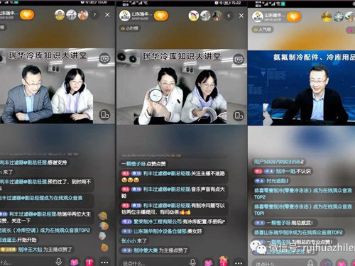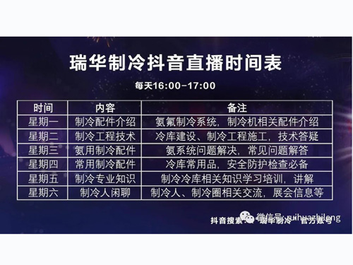 2022年瑞华制冷快速打造了直播团队及直播室,采购了专业设备,为大家讲解制冷知识、氨氟制冷安全、制冷工程答疑等,以后每天16:00定时开播,每天一小时,与大家共同探讨制冷相关问题,欢迎大家关注,抖音搜索“瑞华制冷”关注即可进入直播。