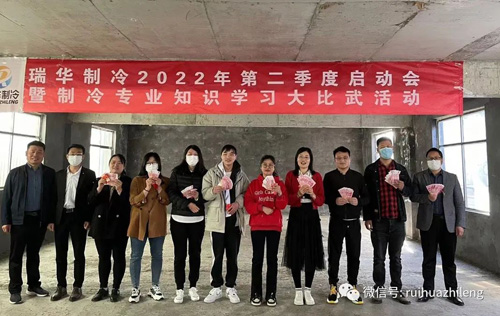 2022年4月16日,春暖花开百花齐放,山东瑞华制冷设备有限公司,在仓储中心新落成的二期仓储内,召开2022年度二季度启动会暨制冷知识大比武。会议表彰了上季度工作突出的家人,对部分人员进行晋升,颁发了本月度的年功奖奖金及为过生日的家人送上生日祝福与礼物,也为二季度开了一个好头。