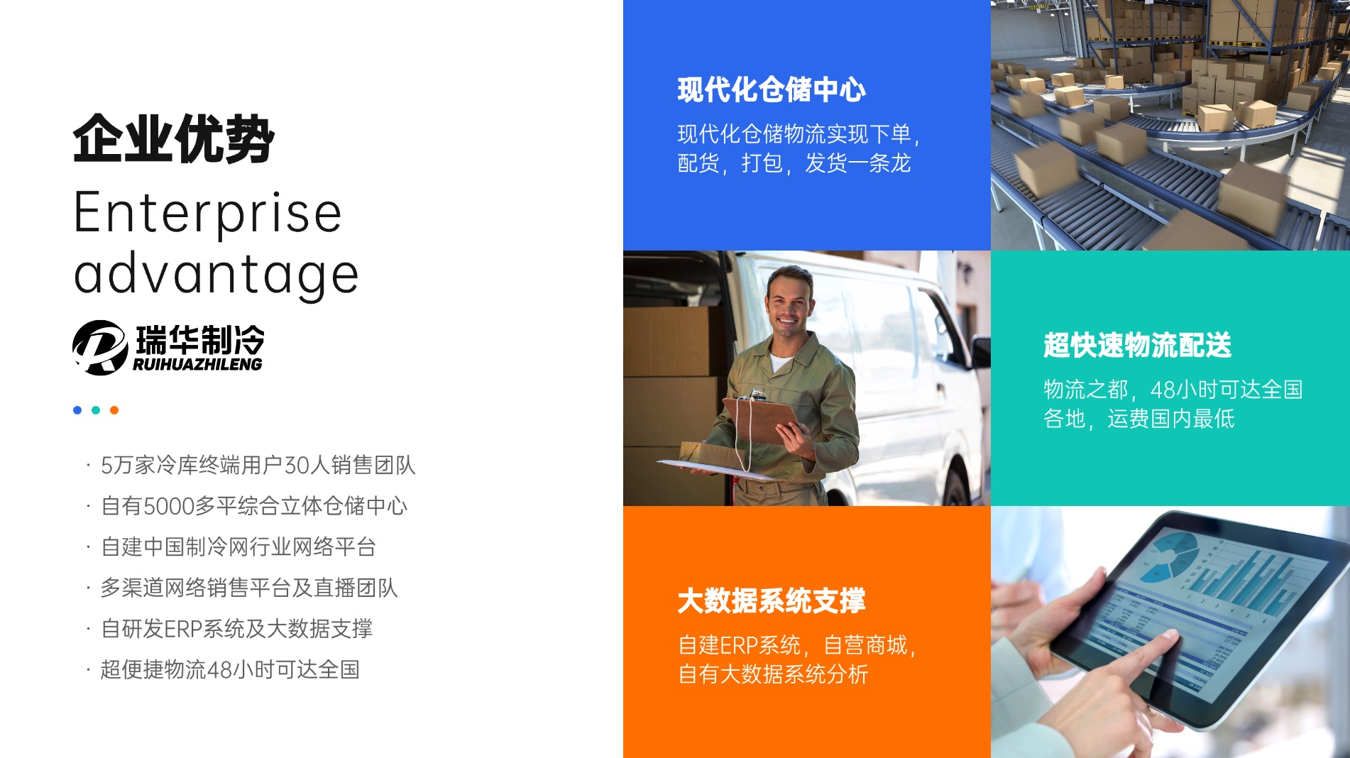 销售渠道依托互联网,以淘宝、阿里巴巴及自有电商平台为主的线上销售模式,同时推广自提、地面推广、上门拜访等线下营销模式。公司自主研发CRM、ERP及WMS仓储系统、订单系统、客服系统等,将公司所有业务流程纳入信息化管理。开发建设华瑞(原中国)制冷网电子商务平台,逐步打造制冷行业产业链综合服务平台。