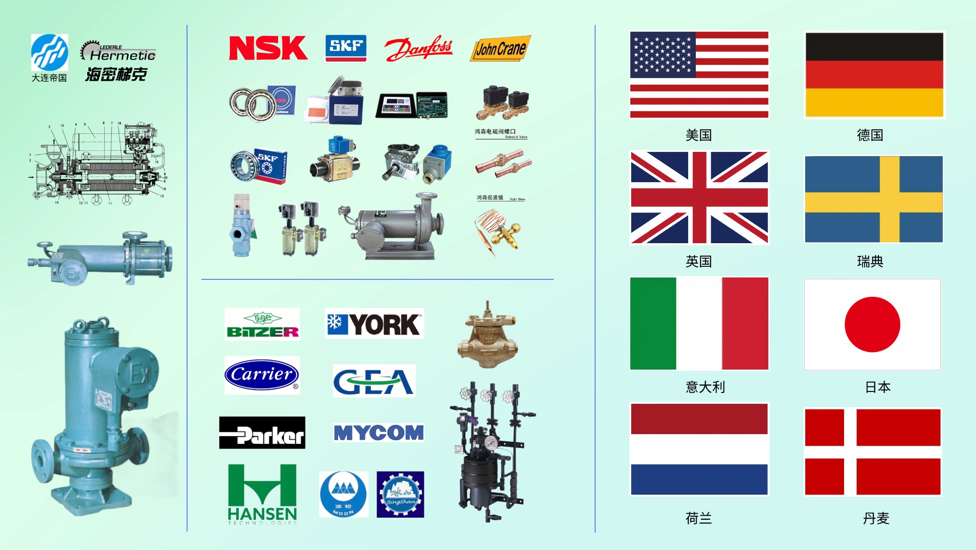 产品包括美国约克,日本前川,大连冰山,烟台冰轮,上海一冷,武汉新世界等品牌的制冷设备及其附属设备,包括低压循环桶,氨液分离器,空分,油分,冷风机,BAC蒸发式冷凝器以及制冰,冷饮设备等相关产品;中央空调,氟利昂制冷压缩机等相关制冷产品。