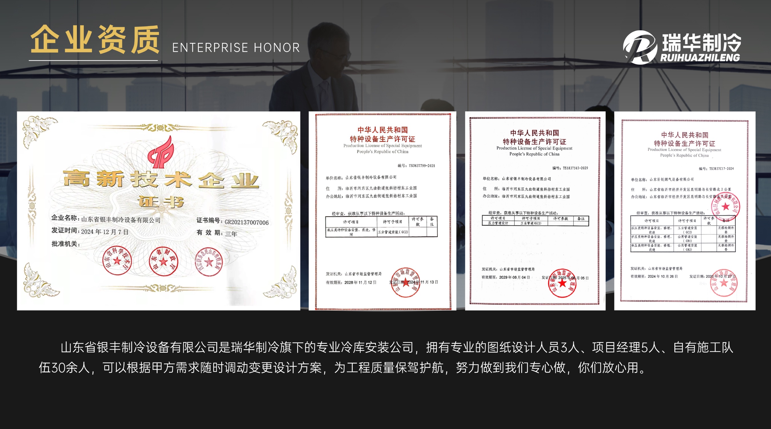 山东省银丰制冷设备有限公司是瑞华制冷旗下的专业冷库安装公司,拥有专业的图纸设计人员3人、项目经理5人、自有施工队伍30余人,可以根据甲方需求随时调动变更设计方案,为工程质量保驾护航,努力做到我们专心做,你们放心用。